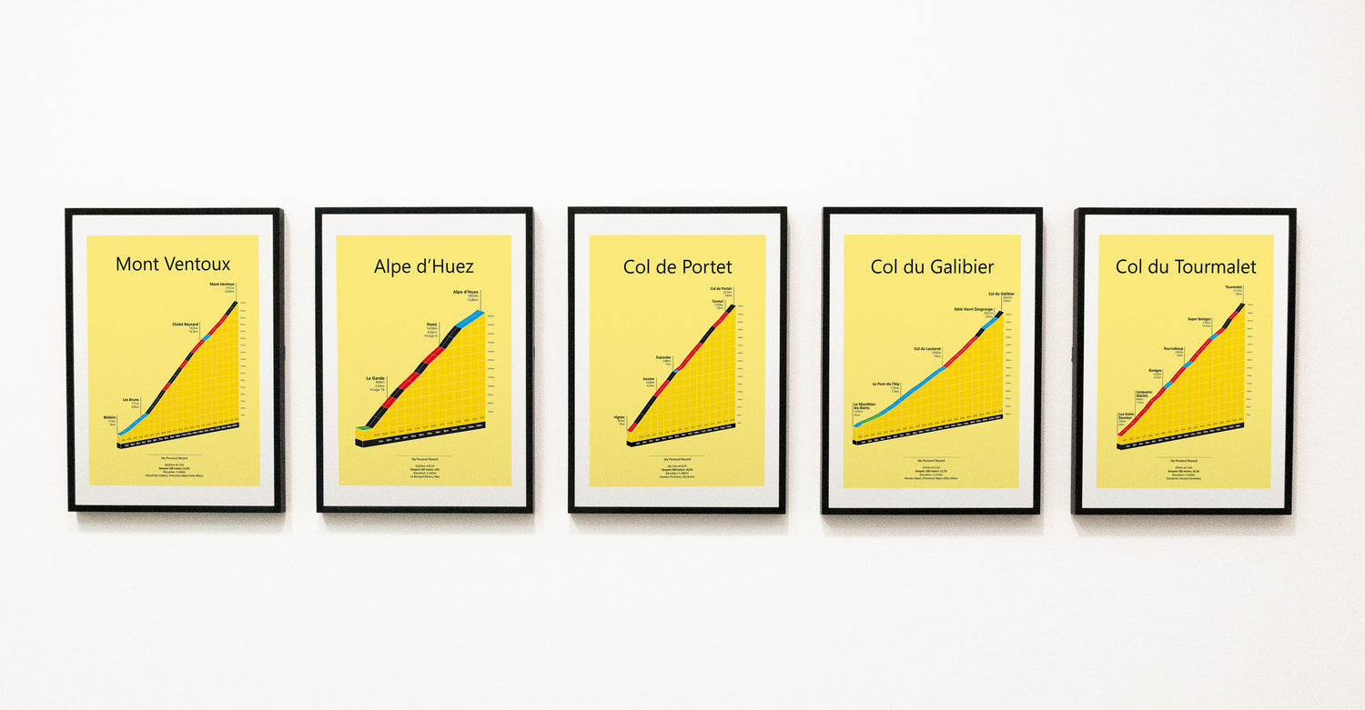Se vores udvalg af stigningsplakater med legendariske franske bjerge fra bl.a. Tour de France.