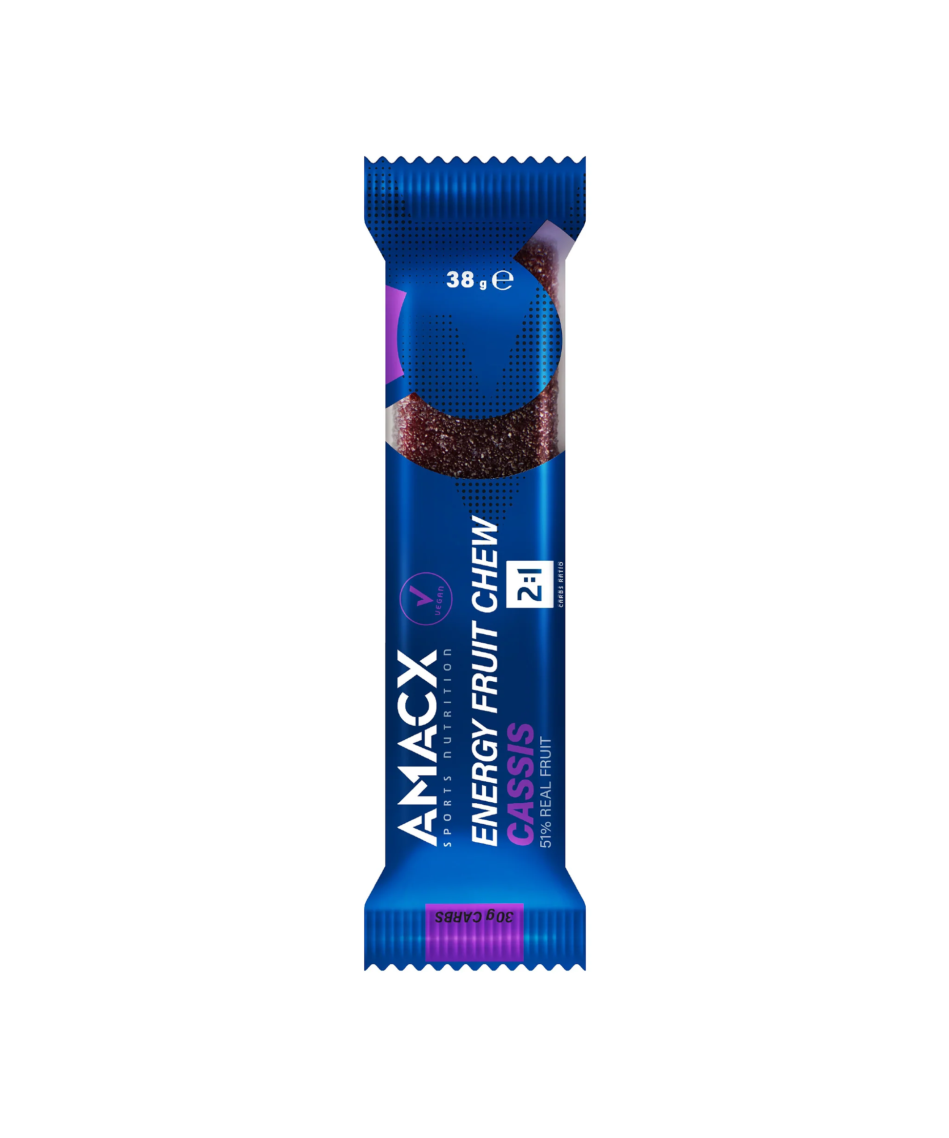Amacx Energy Fruit Chew Cassis med smag af solbær er en slikagtig frugttyggebar, der er specielt udviklet og sammensat til at maksimere din præstation gennem et optimalt forhold mellem glucose- og fructose-kulhydrater (2:1). Tyggebarens to-til-en ratio af glucose og fructose sikrer hurtig kulhydratoptagelse, hvilket støtter din energiforsyning (glykogen). Amacx Energy Fruit Chew smelter ikke i lommen og er hurtig at spise, hvilket gør den velegnet til indtagelse under motion.